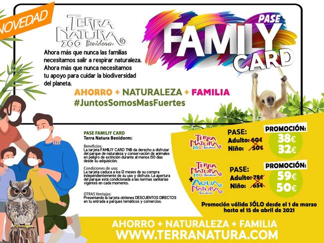 Pensando en las familias, Terra Natura Benidorm lanza una nueva modalidad, Pase Family Card. “Los beneficios son muchos”, recuerda Javier Zapata, director comercial y de Marketing de Terra Natura. “Las personas que lo compren pueden venir al parque durante todo el año por 38€ adultos, y 32€ infantil. Además del pase combinado: Terra Natura Benidorm + Aqua Natura Benidorm, por el precio de 59€ adultos, y 50€ infantil”. En esta ocasión, como novedad, se incluirán diversos descuentos en establecimientos y comercios de la provincia de Alicante.