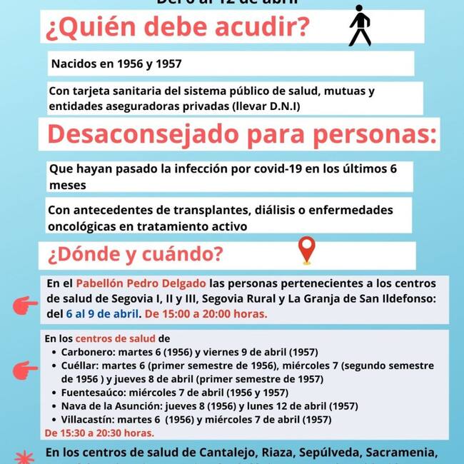 Los servicios sanitarios se pondrán en contacto con la población diana para concertar la cita de vacunación en las zonas básicas de salud de Cantalejo, El Espinar, Navafría, Riaza, Sacramenia y Sepúlveda. Los ciudadanos afectados deben de acudir a sus centros sanitarios con tarjeta sanitaria del sistema de salud pública, de entidades privadas o mutuas. Además, es imprescindible presentar el DNI.