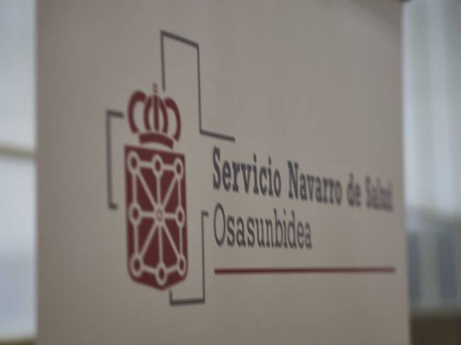 Cartel anunciador del servicio navarro de salud en el Antiguo colegio de Maristas. / Eduardo Sanz - Europa Press (EUROPA PRESS)