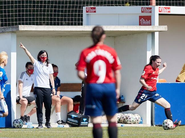 La entrenadora de Osasuna Kakun Mainz dando instrucciones desde el banquillo en un partido anterior en Tajonar / C.A Osasuna