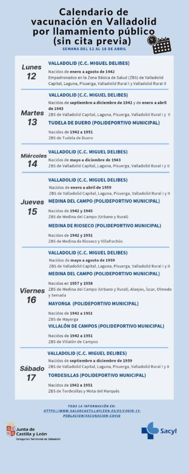 La Junta de Castilla y León ha hecho público también los tramos de edad para mañana sábado, 17 de abril: en Valladolid capital será el turno de los nacidos ente septiembre y diciembre del 59 y en Tordesillas, para las zonas básicas de Tordesillas y Mota del Marqués, se vacunará a los nacidos entre el 42 y el 51.
