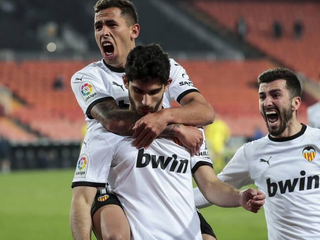 Guedes, Gayà y Oliva celebran un gol con el Valencia / Getty Images