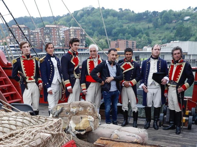 Alejandro Amenábar junto a varios extras en el barco convertido en set de rodaje / Juan Herrero (EFE)