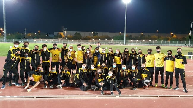 Atletas, entrenadores y representantes del club posan en las inmediaciones de la pista de atletismo de Elx / CA Safor Teika