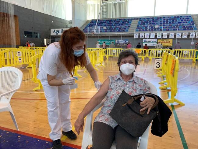 Alegría y tranquilidad entre los pacientes de Águilas de entre 70 y 79 años, que hoy han recibido la dosis de Pfizer en el pabellón Diego Calvo de su municipio, según ha relatado Ángel Benítez, uno de los enfermeros que está administrando las vacunas allí.