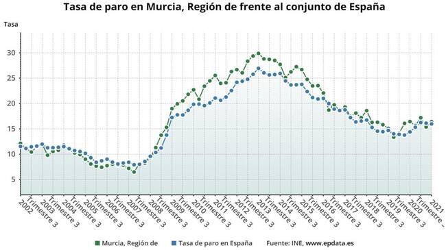 Por lo que respecta a la tasa de actividad regional, alcanzó el 59,33 por ciento, frente al 57,69 del conjunto de nacional. La Región tuvo en el primer trimestre de 2021 la séptima mayor tasa de paro del país por comunidades, con un 16,42 por ciento.