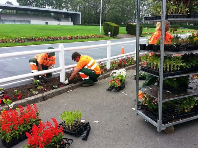 Jardineros de la empresa municipal cambiando las plantas de Las Mestas.
