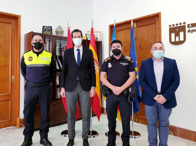 El alcalde de Elda, Rubén Alfaro, acompañado por el concejal de Seguridad Ciudadana, Enrique Quílez, y el jefe de la Policía Local de Elda, Francisco Cazorla, ha recibido esta mañana al nuevo jefe de la Agrupación de Voluntarios de Protección Civil de Elda, Sergio Requena.