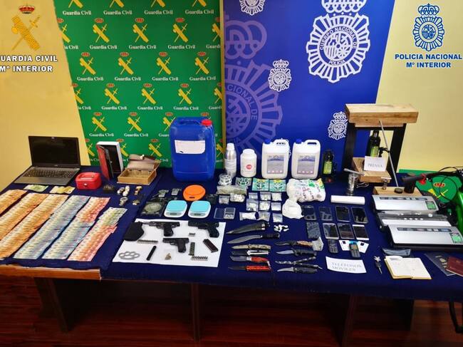 Los Cuerpos y Fuerzas de Seguridad del Estado se han incautado de dos pistolas, una de calibre 9 mm. Parabellum con 24 cartuchos y la otra de 7,65 mm. También de una pistola de aire comprimido, 172 gramos de cocaína, de los que 40,5 estaban listos para ser distribuidos en 58 dosis, 25 gramos de marihuana, 1.000 gramos de cafeína, sustancia utilizada para el corte de la cocaína, un puño americano, una navaja mariposa y un puñal, armas todas ellas prohibidas.