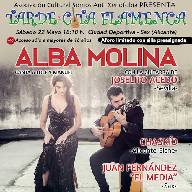 El evento contará con la única actuación en la provincia de Alicante de la gira primavera-verano de Alba Molina, hija de la mítica pareja artística y matrimonial "Lole y Manuel", y cuyas canciones interpretará junto al prestigioso guitarrista, también sevillano, Joselito Acedo. También estarán presentes artistas de la provincia como los hermanos Chaskío, y el guitarrista sajeño Juan Fernández " El Media".