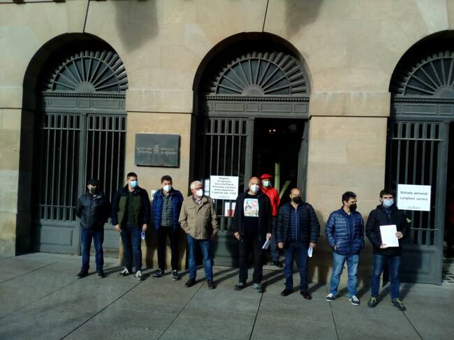 Firmantes del acuerdo por el transporte ferroviario en Navarra ante la sede del Gobierno Foral / Cadena SER