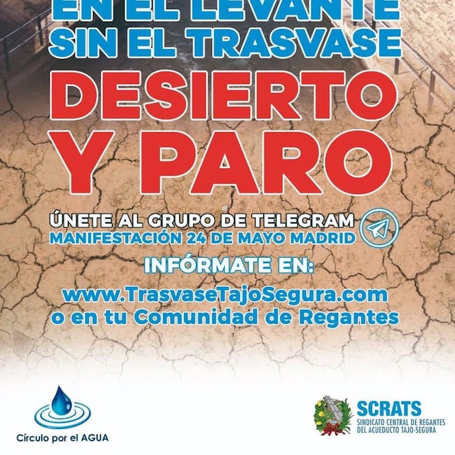 Sigue la presión. Los regantes del trasvase Tajo-Segura se manifestarán en Madrid, el próximo 24 de mayo, contra la pretendida modificación de las normas que rigen el trasvase y el "injustificado" incremento de los caudales ecológicos en el Tajo por parte del Gobierno central. El lema: 'En el Levante, sin el trasvase, desierto y paro'.