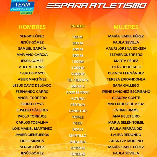 La Federación Española de Atletismo ha dado a conocer este martes a los atletas que participarán en el Campeonato de Europa de Selecciones, que tendrá lugar entre el 29 y 30 de mayo en el estadio Silesia, en Chorzow (Polonia). Entre los 50 deportistas llamados a formar filas con la federación, han sido dos los atletas del Tenerife CajaCanarias elegidos para asumir el reto: el velocista palmero Samuel García, convocado para los 400 metros lisos y el relevo 4×400; y el vallista tinerfeño Jesús David Delgado, para los 400 vallas.