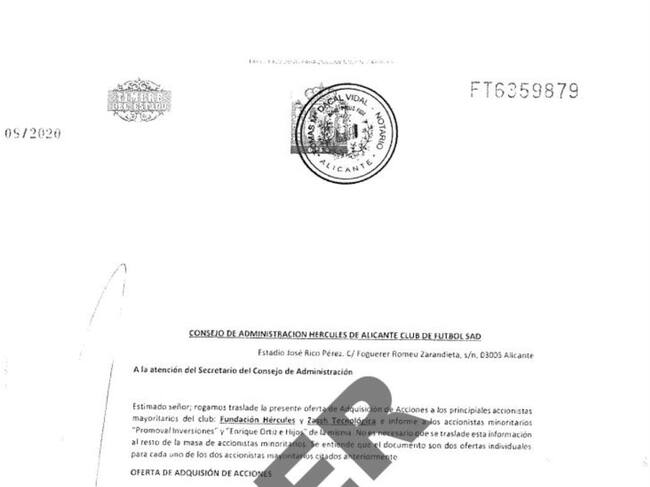 “Por la presente les comunico una OFERTA DE ADQUISICIÓN DE ACCIONES por la totalidad de su participación accionarial en la mercantil HÉRCULES, CLUB DE FUTBOL, Sociedad Anónima Deportiva, libres de cargas y gravámenes, por parte de un grupo solvente de socios y seguidores de "El Club", todos ellos afincados en la provincial de Alicante.