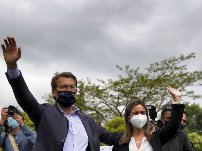El presidente de la Xunta y líder del PPdeG, Alberto Núñez Feijóo, y la presidenta del Comité Organizador del próximo congreso, Pepa Pardo, clausuran la junta directiva del partido este martes en Santiago de Compostela, durante la que anunció que se presentará a la reelección como líder del PPdeG. / Lavandeira jr (EFE)