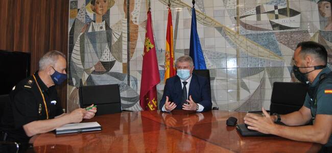 Reunión del Delegado del gobierno, José Vélez con el jefe Superior de Policía, Alfonso Navarro, y Diego Mercader, teniente coronel de la Guardia Civil de Murcia / Delegación del Gobierno