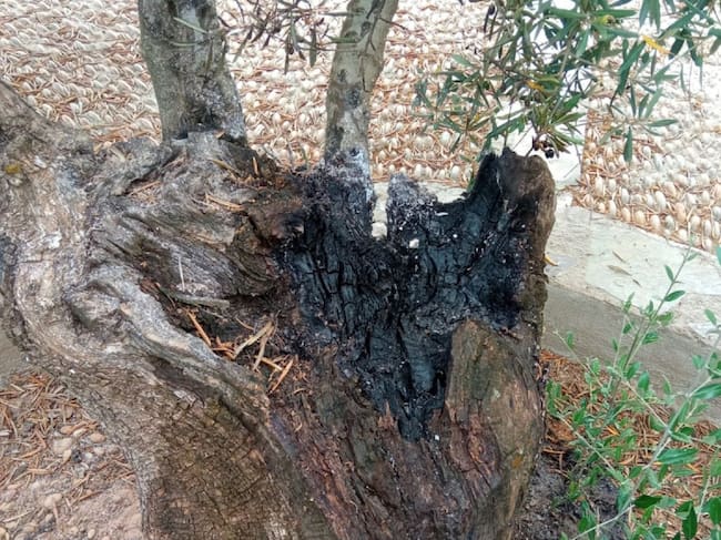 Así ha quedado uno de los dos olivos centenarios contra los que han atentado esta madrugada en la localidad de Carboneros / Radio Jaén