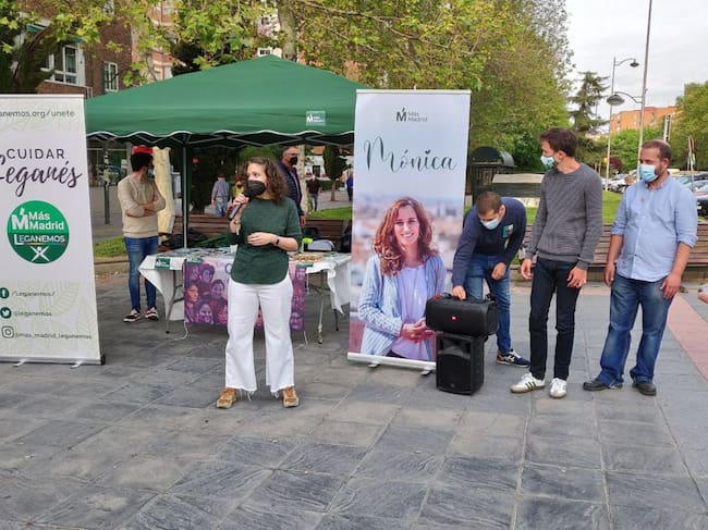 Eva Martínez (i) en un acto electoral durante la campaña de las pasadas elecciones a la Asamblea de Madrid. A la derecha de Iñigo Errejón (2d), el otro edil de la formación en el Ayuntamiento de Leganés, Fran Muñoz. / Más Madrid Leganemos