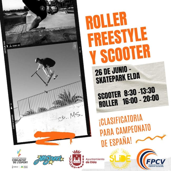 Las instalaciones del Skate Park de Elda acogerán el sábado 26 de junio el Campeonato Aurtonómico de Roller Freestyle y Scooter Freestyle. Ambas pruebas, organizadas por la Federación de Patinaje de la Comunidad Valenciana y con la colaboración del Ayuntamiento de Elda, a través de la Concejalía de Deportes, son clasificatorias para el Campeonato de España.