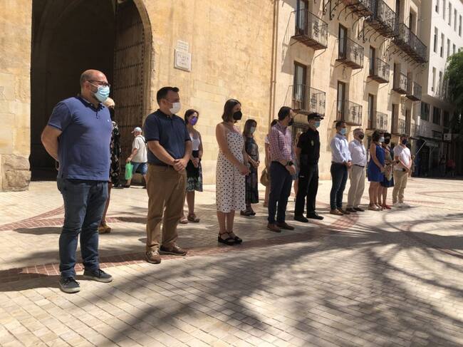El Ayuntamiento de Elche ha mostrado su repulsa contra la violencia machista esta mañana, en la Plaça de Baix. Miembros del Gobierno municipal han guardado un minuto de silencio después de que se haya confirmado como machista el asesinato de una mujer de 42 años en la provincia de Castellón el pasado 21 de abril.