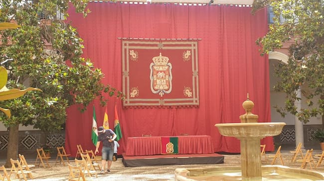 Preparativos en el patio del Ayuntamiento de Granada para la celebración del pleno de investidura que elegirá este 7 de julio de 2021 al nuevo alcalde de la ciudad / Rafael Troyano