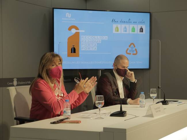 La cònsol major de la capital, Conxita Marsol, i el conseller de sostenibilitat, Gerar Estrella, durant la presentació de la prova pilot de recollida de brossa porta a porta.(ANA)