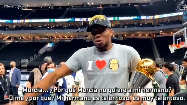Es una de las anécdotas de la celebración de los Bucks tras ganar la NBA ante los Suns. Tras el partido, una de las cámaras de Movistar captó un momento que, de nuevo, vuelve a poner a Murcia en el foco del panorama internacional. En este caso, ha sido Giannis Antetokounmpo el causante. Su hermano Álex juega en el filial del UCAM Murcia CB y, aunque está en dinámica con el primer equipo e inclusó llegó a debutar en Liga Endesa, esto no parece ser suficiente para el campeón de la mejor liga de baloncesto del mundo.