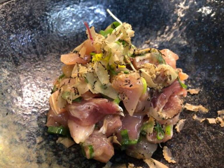 - Hacemos una especie de croqueta y lo freímos con un crujiente: harina de garbanzo, la falsa clara de huevo y panco con unas cortezas de trigo que picamos, a lo que echamos orégano y cilantro