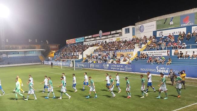 Salida de los dos equipos y trio arbitral, antes del encuentro entre el CD Alcoyano y el Betis Deportivo, ante la mirada del público de El Collao. / Radio Alcoy