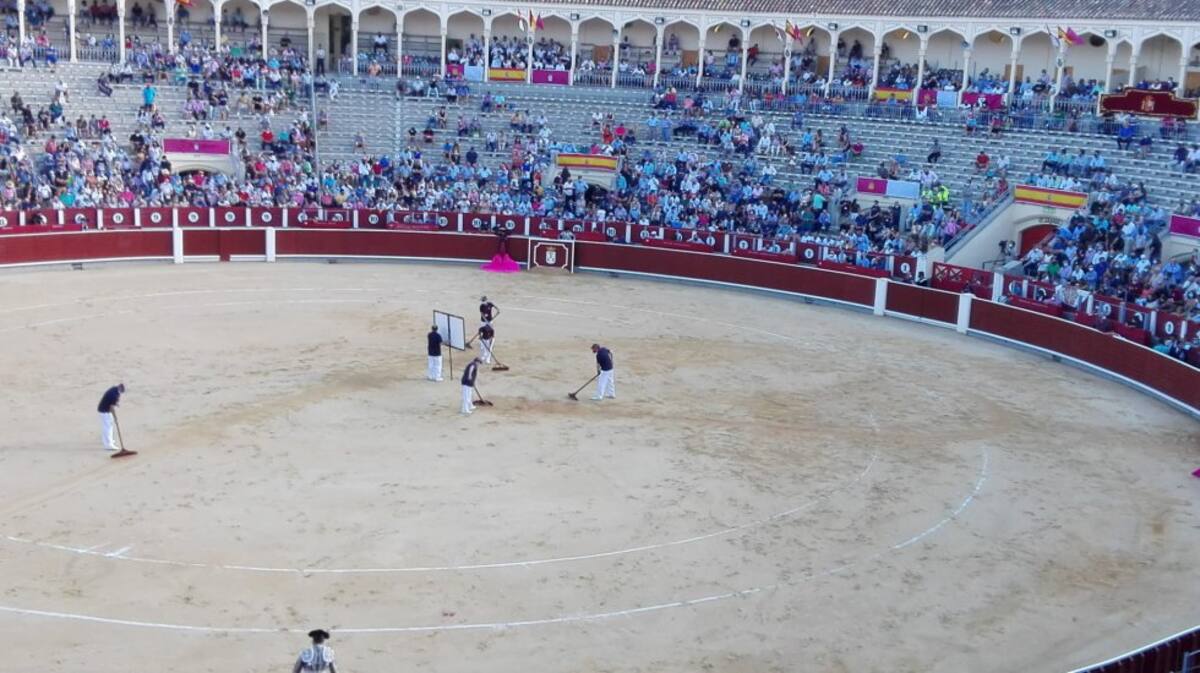 Operarios de la Plaza de Toros limpian el albero