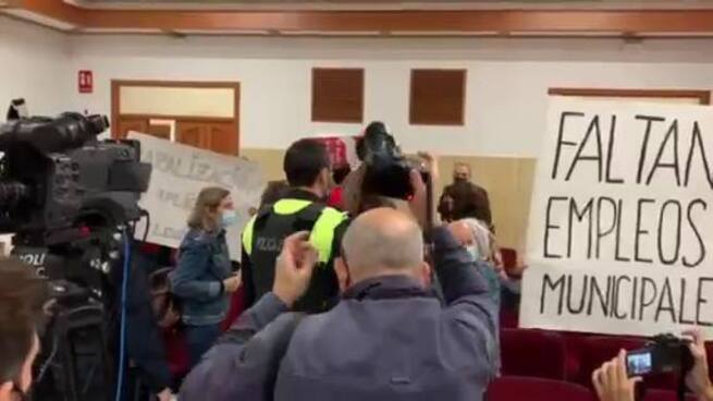 El Pleno de este jueves era el primero con asistencia de público desde el comienzo de la pandemia. Un Pleno que ha tenido que ser desalojado en los primeros minutos por las protestas de los asistentes, que han cargado duramenter contra la gestión del concejal de Recursos Humanos, Bernardo Jordano, por la convocatoria de un proceso selectivo libre para las plazas de los trabajadores temporales del Ayuntamiento, sin tener en cuenta los años de servicio y experiencia en su puesto y a pesar de que ya existe un decreto ley que regulariza la temporalidad en las administraciones. Críticas del personal interino y también de los sindicatos que protestan por la presunto privatización del servicio de porteros en los colegios municipales. Tras varias llamadas al orden por parte del Alcalde, finalmente, el salón de plenos tuvo que ser desalojado de forma pacífica.