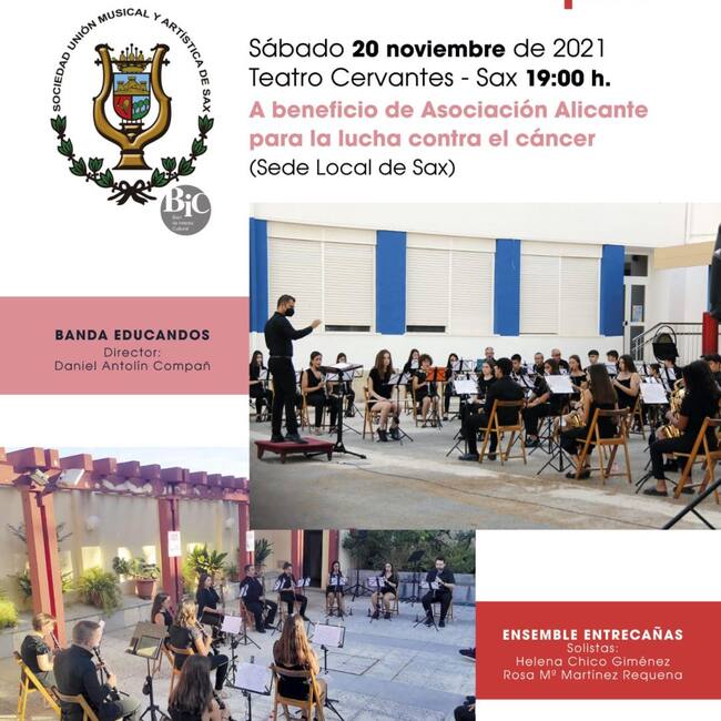 Este sábado a las 7 de la tarde, en el teatro Cervantes, actuará la Banda de educandos y el ensemble ‘Entrecañas’ que ofrecerán un concierto benéfico, en colaboración con la Asociación Alicante para la lucha contra el cáncer (sede local de Sax). El donativo es de 3 euros y las entradas se pueden adquirir en el local social de la Unión Musical, en la sede sajeña de la Asociación Alicante para la lucha contra el cáncer y en la Panadería Avelina.