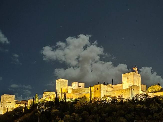 La Alhambra, con la Alcazaba y la Torre de la Vela en primer plano, desde el Mirador de Carvajales, en el Albaicín (Granada) en la última luna llena en noviembre de 2021 / Rafael Troyano