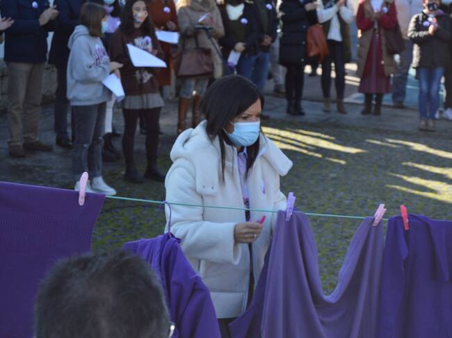 Nidia Arévalo colgado ropa morada en este 25N / Concello de Mos