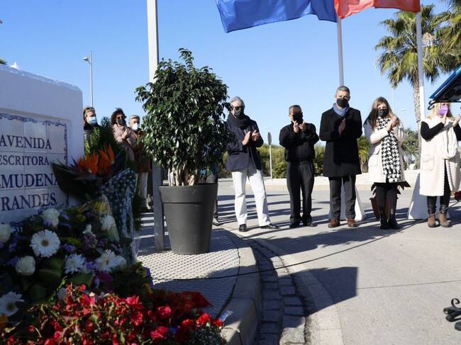 La misma avenida que el Consistorio rotuló con el nombre de Almudena Grandes, en el entorno de Punta Candor, se ha convertido en este domingo en escenario para la ofrenda de flores, las condolencias a su familia y amigos y las sentidas palabras de todos cuantos han intervenido en este acto.