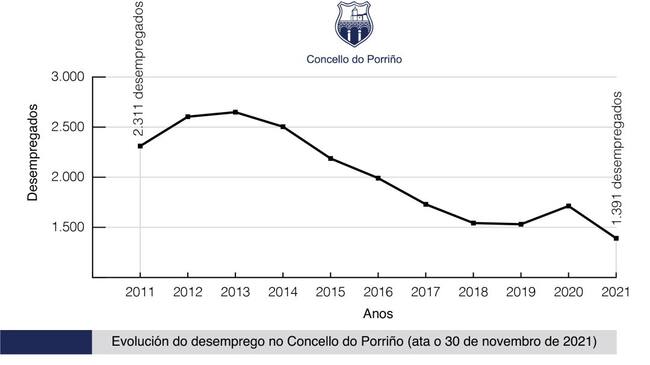 En concreto en 2011, o número de parados rexistrados en Porriño era de 2.311 desempregados, namentres que en 2021 (con datos ata 30 de novembro) é de 1.391 desempregados.