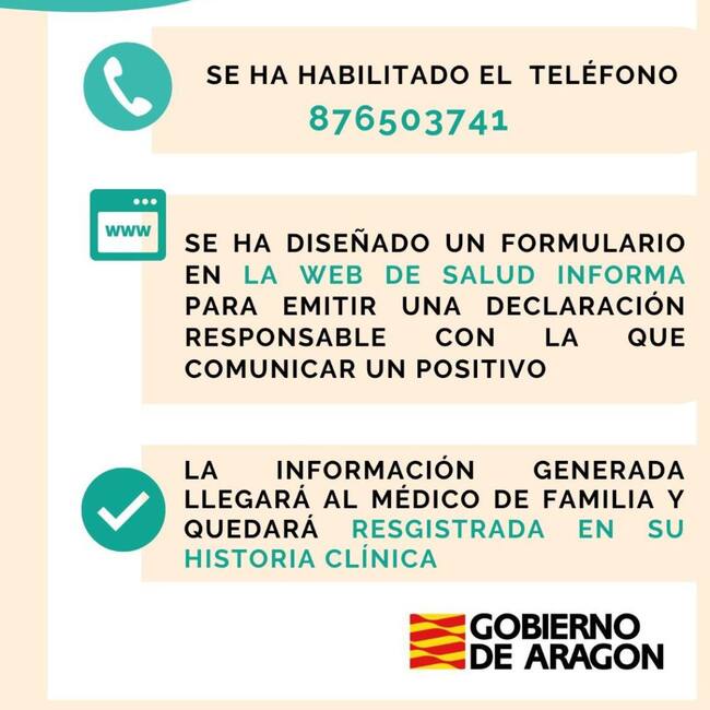 La petición de bajas y las notificaciones de positivos están colapsando los centros y por ello se ha habilitado un número de teléfono para realizar las trámites, el 876 503 741 y además se puede notificar en Salud Informa. Para ello hay que realizar una declaración responsable del positivo obtenido en casa con un test de antígenos y rellenar el formulario que se ha diseñado.