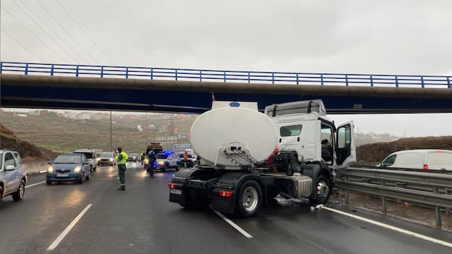 Un camión cisterna se ha visto implicado en un accidente junto con otro vehículo en la autopista Tenerife 1 en dirección hacia el sur de la isla en el barrio de Añaza / Policía Local Santa Cruz