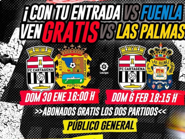 El Efesé quiere llenar el Cartagonova las próximas dos jornadas o al menos, como indicaba di director deportivo, Manolo Sánchez Breis en redes sociales, alcanzar las 10.000 personas para recibir al Fuenlabrada este domingo a las 16:00 y a la UD Las Palmas el próximo a las 18:15. Para ello, desde el club albinegro han puesto en marcha una promoción de 2x1 por la que los aficionados albinegros podrán comprar la entrada para el primero de los partidos y recibir otra gratis para ver al conjunto canario. Los precios son los habituales: 25 euros en tribuna, 18 en lateral y 15 en los fondos.