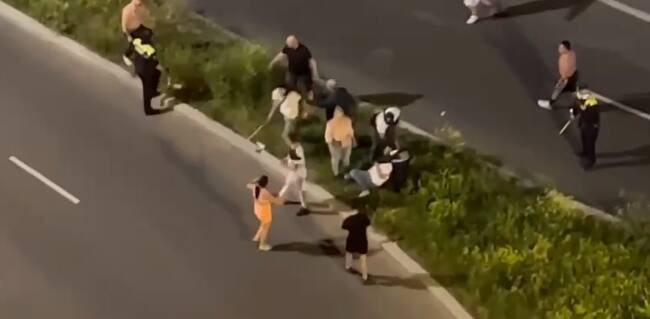 En un momento de las imágenes se ve llegar a la Policía, pero la pelea continúa.