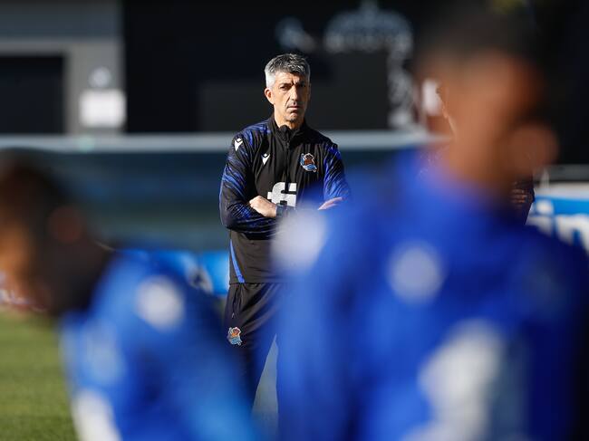 GRAFCAV2491. SAN SEBASTIÁN (ESPAÑA), 09/02/2022.- El entrenador de la Real Sociedad Imanol Alguacil (c), dirige el entrenamiento celebrado este miércoles por el equipo en el campo de Zubieta de San Sebastián. EFE/Juan Herrero. / Juan Herrero (EFE)