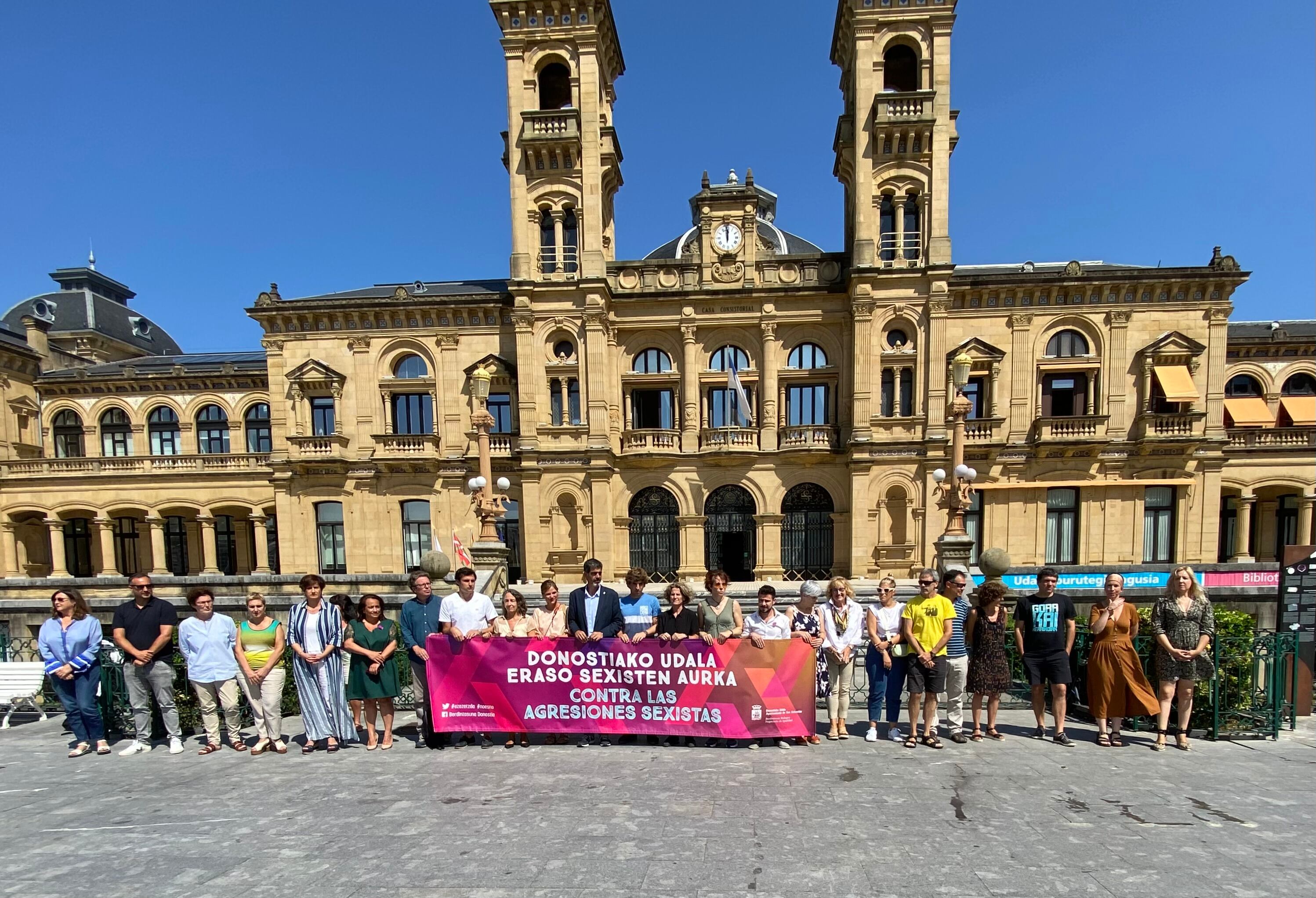 El alcalde de San Sebastián, Eneko Goia, ha condenado las dos últimas agresiones sexistas cometidas en la ciudad y ha confiado en que la justicia tenga la "respuesta adecuada" a estos comportamientos. Goia ha participado este martes en la concentración convocada por el Ayuntamiento frente a la sede consistorial a la que han acudido representantes de todos los grupos municipales además del presidente de las Juntas Generales de Gipuzkoa, Xabier Ezeizabarrena, y otros miembros de la cámara foral, situados tras una pancarta con la leyenda "Contra las agresiones sexistas".