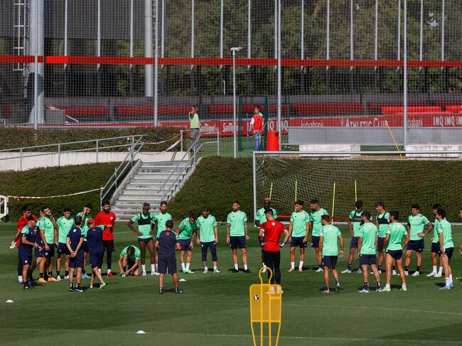 GRAFCAV8380. LEZAMA (BIZKAIA), 28/07/2022.- El entrenador del Athletic de Bilbao, Ernesto Valverde (c), dirige el entrenamiento que el conjunto rojiblanco ha celebrado este jueves en sus instalaciones de Lezama (Bizkaia). EFE/Miguel Toña / Miguel Toña (EFE)