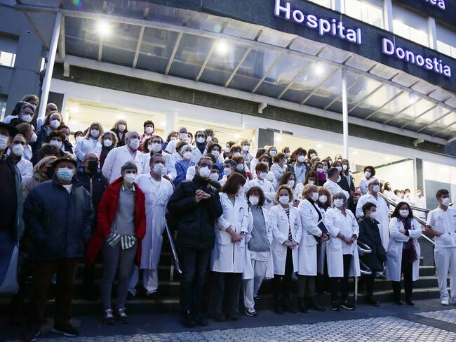 Los jefes de servicio de la OSI Donostialdea concentrados en la escalinata del Hospital Donostia para protestar por los ceses y reivindicar sus reclamaciones a la dirección de Osakidetza. EFE/Gorka Estrada. / Gorka Estrada (EFE)