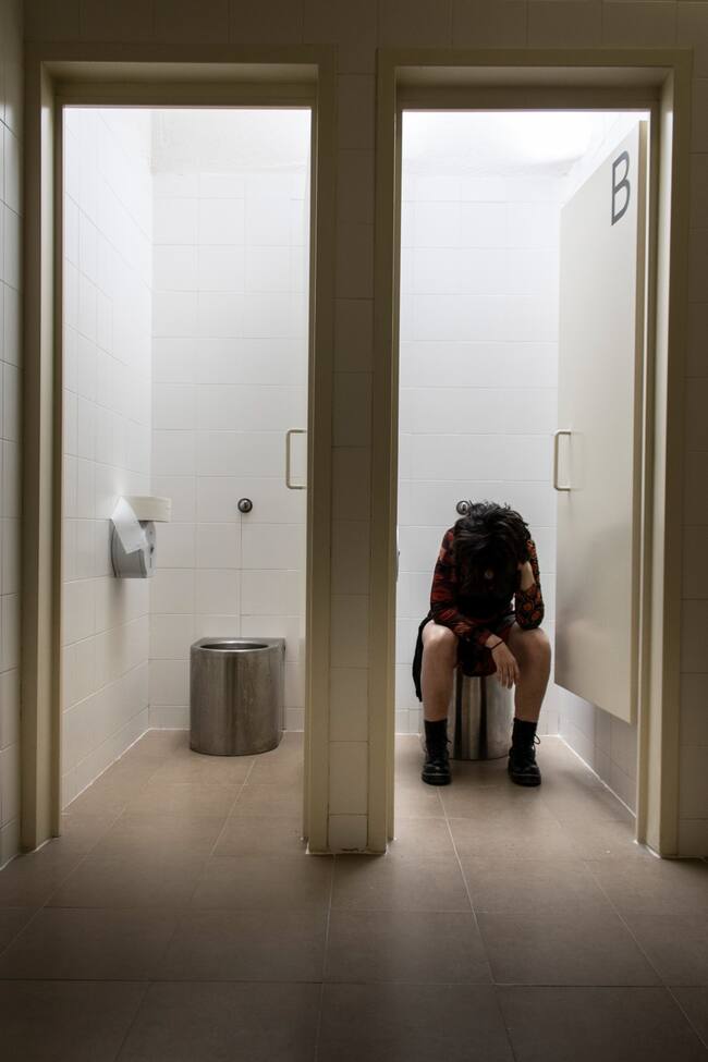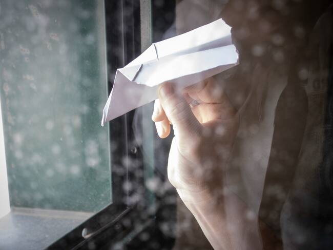 La primera imagen muestra rincón de la biblioteca de la prisión con estanterías repletas de libros, en la segunda una mano vista a través de un cristal sostiene un avión de papel, en la tercera una mujer cabizbaja está sentada en un inodoro y en la última se puede ver una silla vacía frente a una ventana abierta.