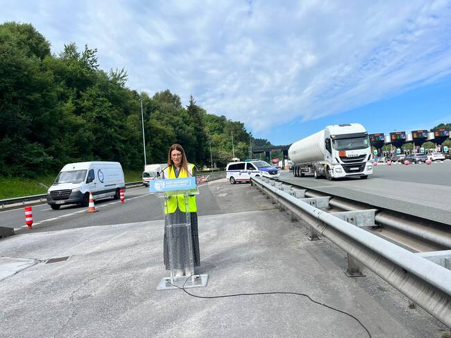 La directora de Tráfico, Estibaliz Olabarri, en la rueda de prensa celebrada en el peaje de la AP-8 de Irun | Fuente: Radio Irun