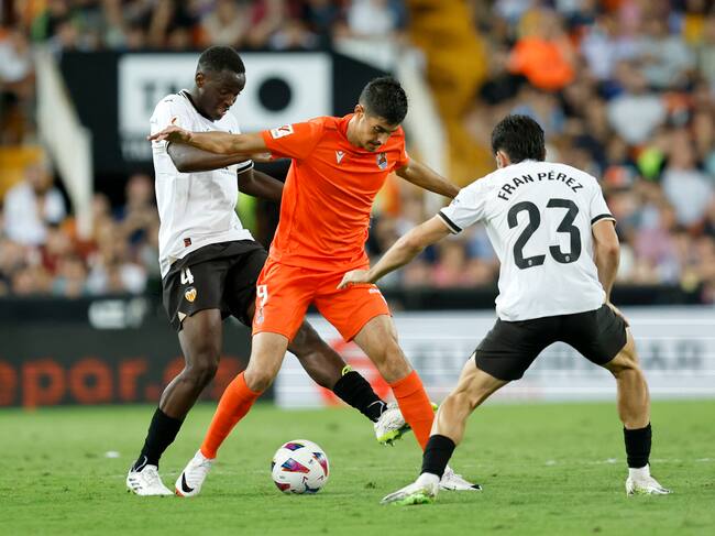 VALENCIA, 27/09/2023.- El delantero de la Real Sociedad Carlos Fernández (c) protege un balón ante Fran Pérez, del Valencia, durante el encuentro de la jornada 7 de LaLiga EA Sports entre Valencia CF y Real Sociedad, este miércoles en el estadio de Mestalla en Valencia. EFE/ Biel Aliño / Biel Alino (EFE)
