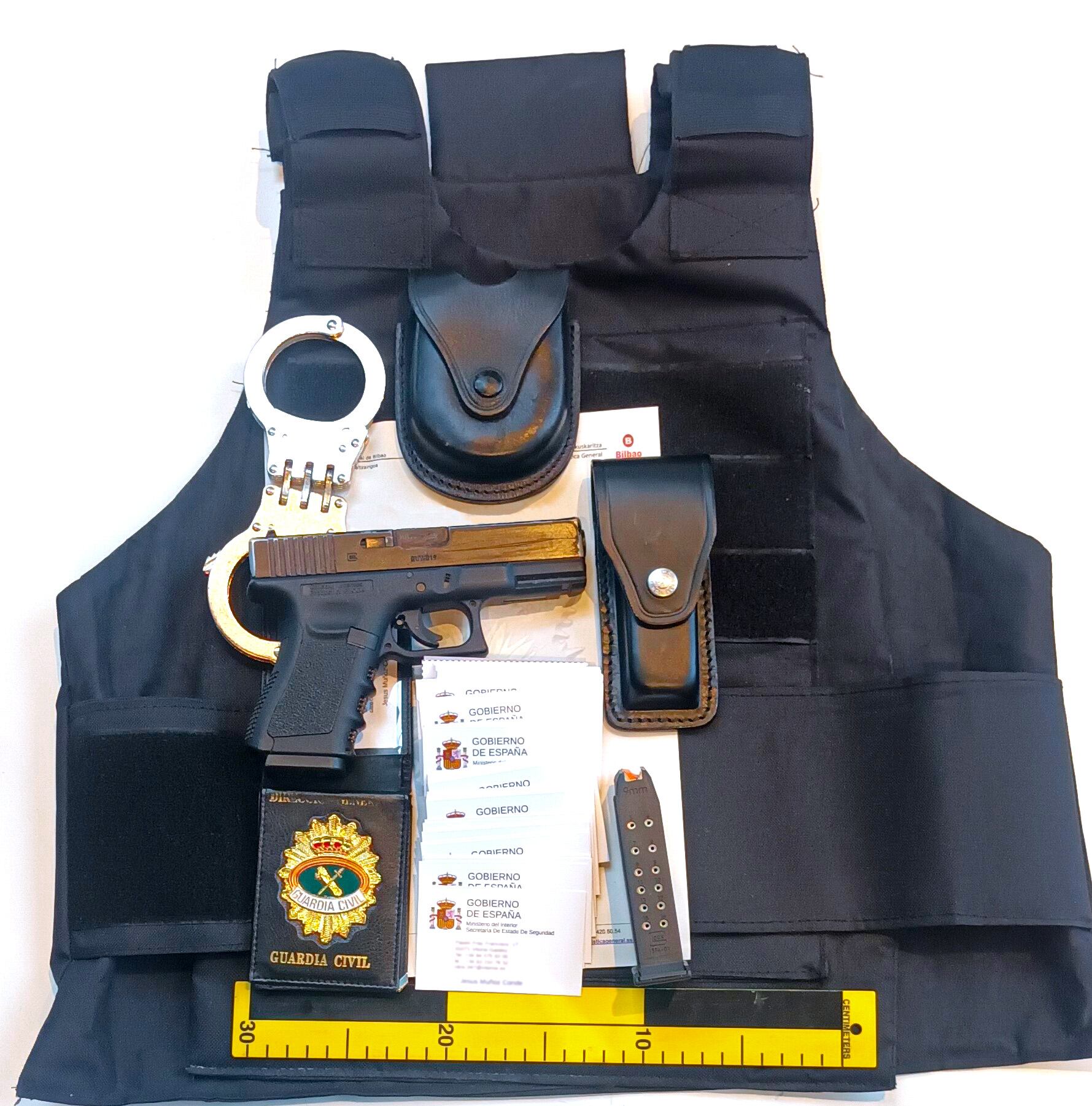 En el registro del vehículo, ante letrado, los agentes encontraron en su interior diverso material de "uso exclusivo policial", como una pistola Glock de aire compromido, un cargador de la misma marca para balas de 9mm con munición real, unos grilletes de uso policial y un chaleco antibalas.