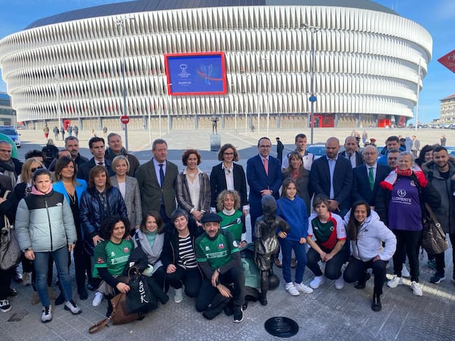 Las personas representantes de las instituciones vascas, UEFA, RFEF, Federaciones Vasca, Alavesa, Guipuzcoana y Vizcaína de Fútbol, Athletic Club, así como representantes de clubes de fútbol y otras personalidades del fútbol femenino en Euskadi han posado con la escultura realizada por el artista y escultor Juan Villa, en colaboración con Capa Esculturas.