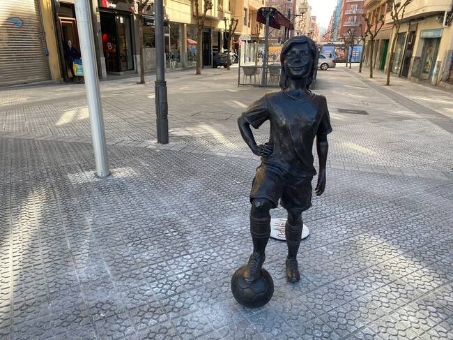 Una escultura de bronce a tamaño real que representa a una niña que mira ilusionada, orgullosa y soñadora a San Mamés ha sido colocada en la calle Licenciado Poza como icono de la igualdad en el fútbol